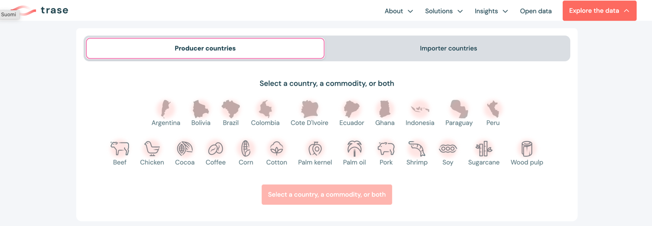 Traseは水、森、林などへの影響を評価するツールです。Traseでは消費国や貿易業者と生産地を結ぶ森林リスクのサプライチェーンが地図化されており、これにより、森林破壊の割合が高い国、地域、事業者の可視化が可能となっています。ただし、対象コモディティは森林破壊との関連の高い13種(大豆、パーム油、牛肉、エビ、ココア、コーヒー、とうもろこし、木材パルプ、パーム核、鶏肉、綿花、サトウキビ、豚肉)のみになっています。